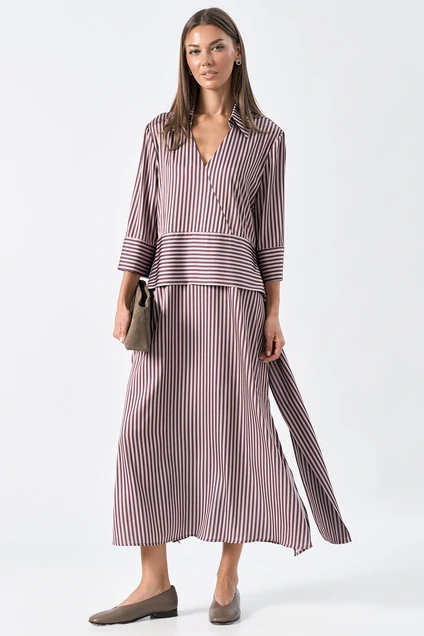 Элегантное платье миди из шелковистой ткани прямого силуэта представлено в классическом сочетании белого и бордового цветов, дополненное вертикальным полосатым принтом. Конструкция платья включает отрезную линию по талии и стильный пояс, подчёркивающий фигуру. V-образная горловина и рукава втачного покроя до локтя обеспечивают комфорт и удобство. Ткань обеспечивает лёгкость и приятные тактильные ощущения, идеально подходит для элегантных повседневных и деловых образов. Обратите внимание, что фотография товара может незначительно отличаться по оттенку из-за различий в цветопередаче мониторов.