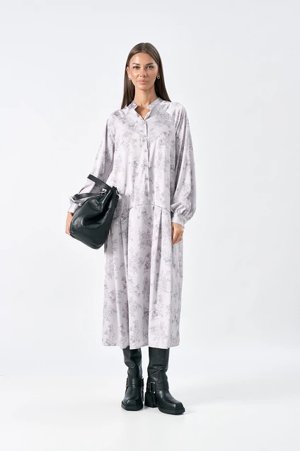 Элегантное шелковое платье в деликатном светло-сером оттенке украшено изящным, тонким цветочным принтом. Дизайн изделия предусматривает подрез по переду, придающий струящуюся форму. Платье дополнено втачными, объемными рукавами на длинных манжетах, закрывающихся на пуговицы, что добавляет благородства образу. Центральная застежка на петли и пуговицы спереди подчеркивает классический стиль платья. Идеальный выбор для создания утонченного и женственного образа. Обратите внимание, что цвет может незначительно отличаться из-за настроек вашего монитора.