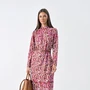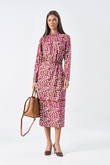 Элегантное женское платье миди с длинным рукавом идеально подходит для демисезонного гардероба. Модель выполнена из высококачественного трикотажного полотна, обеспечивающего комфорт при носке. Дизайн платья украшен мелким цветочным принтом в розово-красных и белых тонах на фоне темно-малиновой основы. Полуприлегающий силуэт подчеркивается деликатным поясом на талии, что добавляет изящества образу. Модель оснащена воротником-стойкой и центральной застежкой на тонкую тесьму-молнию по спинке, создавая аккуратный и современный вид. Длинные втачные рукава и отсутствие подкладки делают платье легким и приятным для тела. Идеальный выбор для работы, встреч и неформальных мероприятий. Обратите внимание, что оттенок изделия на фотографии может незначительно отличаться из-за особенностей цветопередачи вашего монитора.