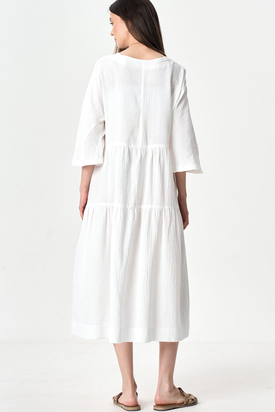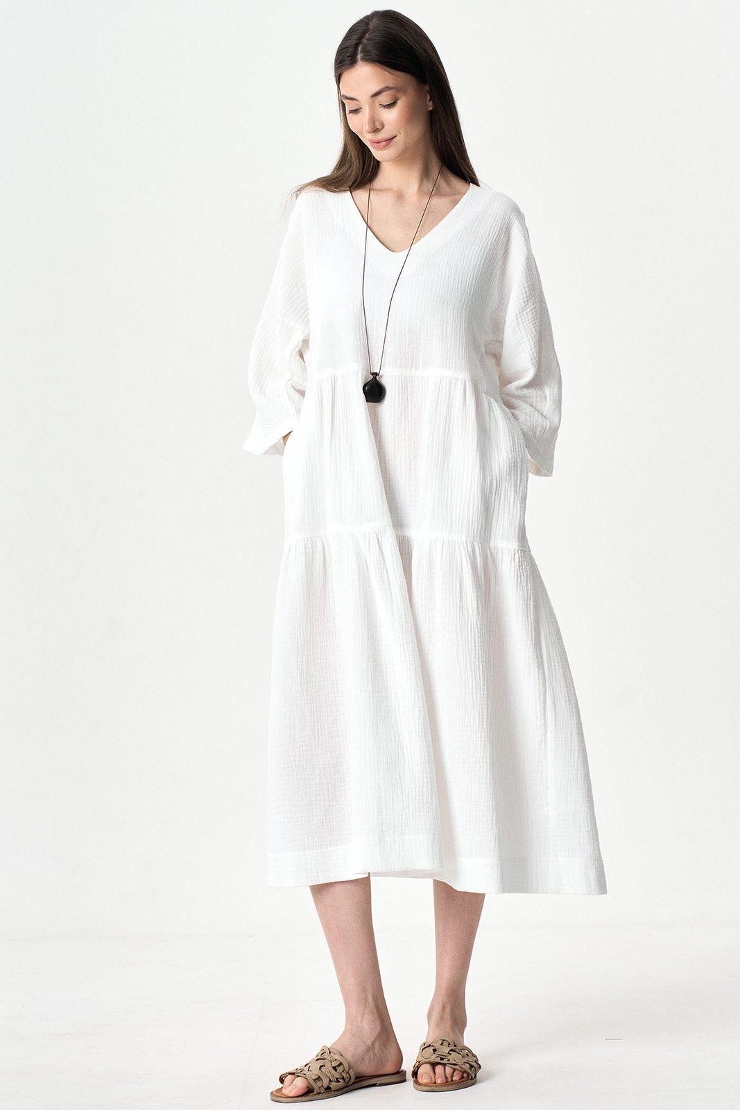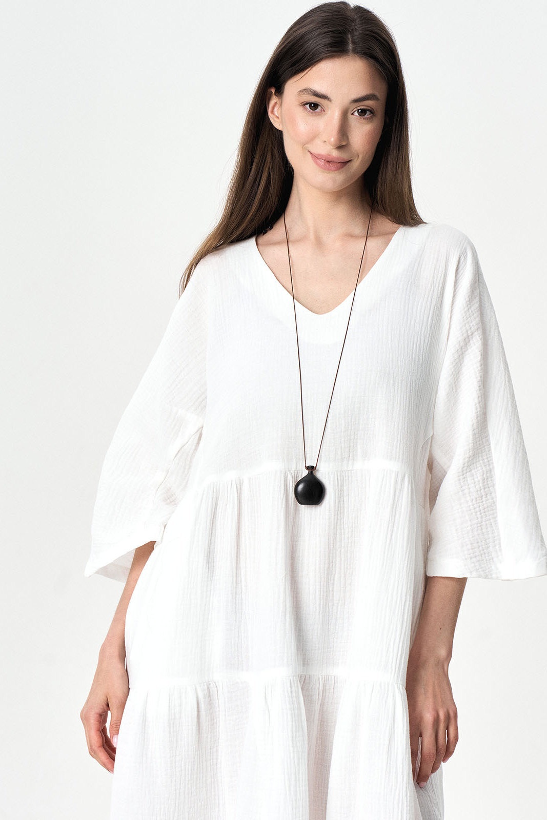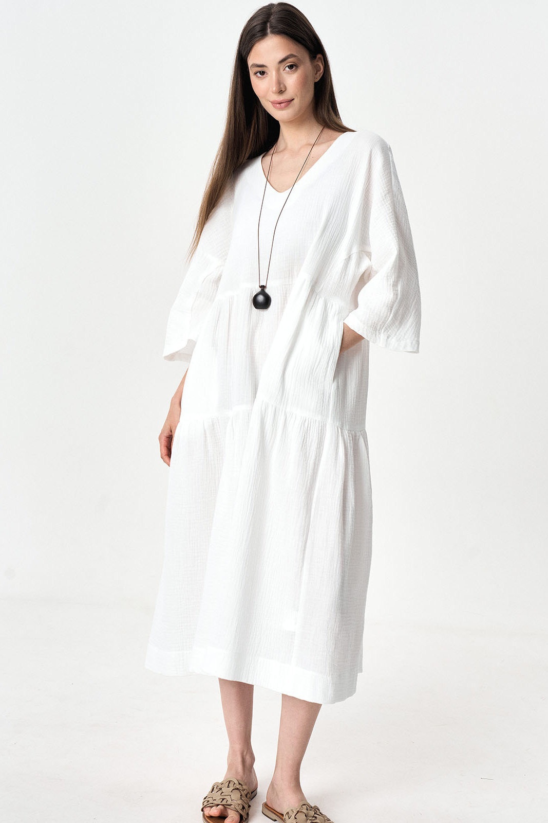 Платье 3481P-1 молочный Art Ribbon из коллекции бренда ArtRibbon выполнено из 100% хлопка. Это лёгкое и воздушное платье миди длины идеально подойдет для летнего сезона. Свободный крой обеспечивает комфорт и свободу движений, а молочный оттенок добавляет образу свежести и нежности. Широкие рукава и V-образный вырез подчеркивают стиль и оригинальность. Отличный выбор для повседневного гардероба, отдыха и непринужденных прогулок.