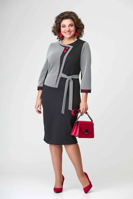 Платье женское, нарядно-повседневное полуприлегающего силуэта, выполнено из трикотажного полотна. Рукав ¾, на манжете с отделкой. Горловина округлой формы. По переду ассиметричный фигурный подрез со вставками и двумя отделочными пуговицами. Лиф с нагрудными вытачками. В области талии завязан ассиметричный поясок. Спинка с талиевыми вытачками, в среднем шве – шлица и застёжка вверху на тесьму-молнию.