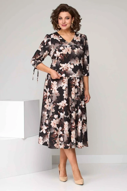 Платье женское, нарядно-повседневное, из тонкой плательной ткани. Горловина V-образная, рукав расширенный, на манжету с завязкой. Лиф платья отложной, имитирует блузку. Юбка платья покроя «клёш». Платье без застёжки. Лиф платья на подкладке.