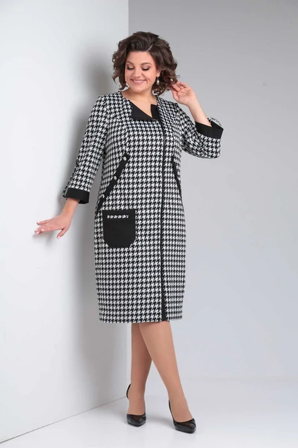 Платье женское повседневное полуприлегающего силуэта из трикотажного полотна разных видов. Платье с асимметричной застежкой на молнию по переду. Под молнией планка из отделочной ткани. Из проймы до линии бедра рельефы с отделочной планкой на пуговицы. Ниже уровня талии асимметричный накладной карман рамкой. Рукав одношевный с манжетами, на пату с пуговицами. Спинка с тканевыми вытачками.