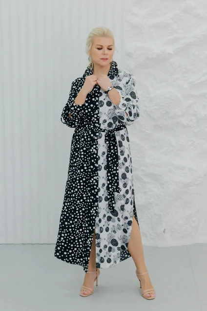 Платье + пояс Длина изделия по спинке: Верх - 135 см Платье прямого силуэта с рукавом ¾. Горловина с рубашечным воротником. Застежка на планку по пе-реду на петли и пуговицы, по боковым швам – разрезы. По низу рукавов при-тачные манжеты.