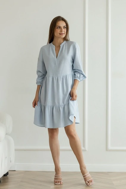 Платье выполнено из 100% умягченного льна,который прошел специальную энзимную обработку,поэтому изделие не колется и не дает усадки.Платье прямое,пышное ,с двумя рядами воланов.Воротник маленькая стойка.Рукав пышный внизу на сбоке.