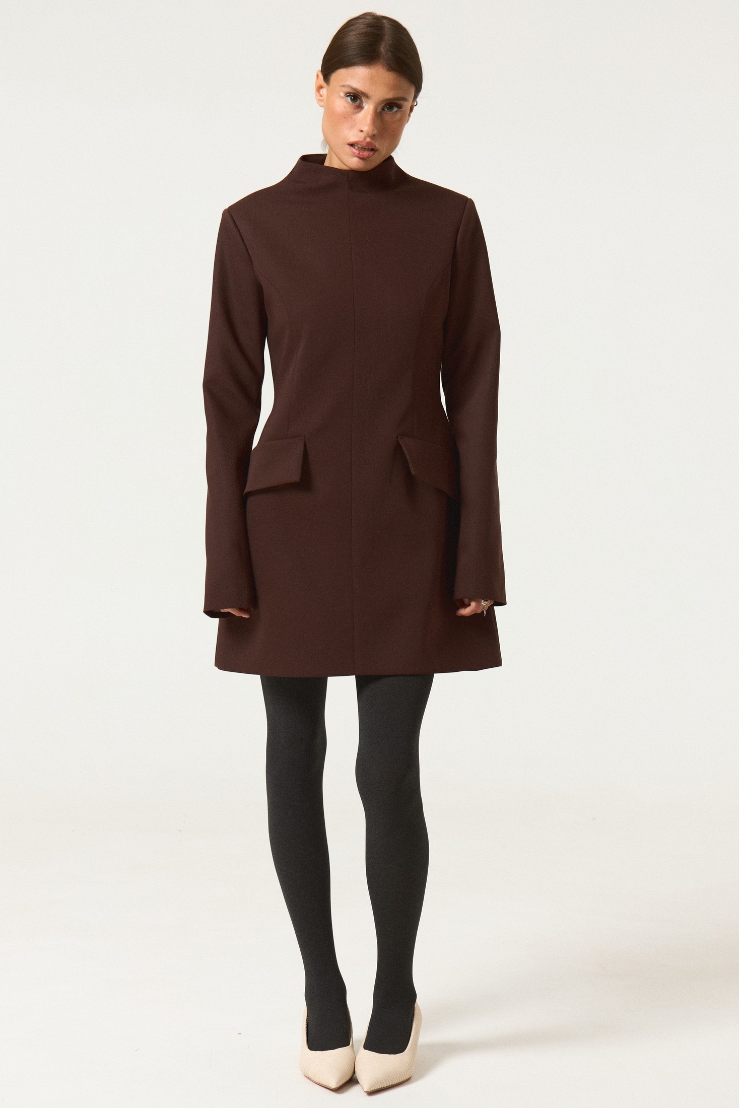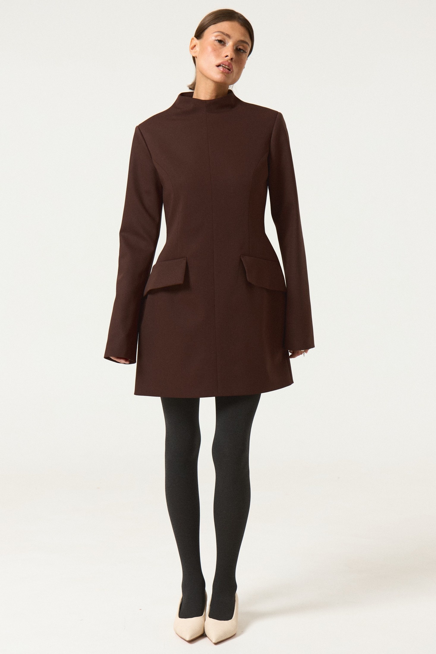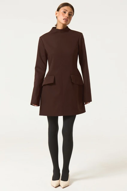 Элегантное коричневое платье приталенного кроя, оснащенное объемной юбкой, создающей изысканный силуэт. Подчеркивающий фигуру верх плавно перетекает в игривую юбку, добавляя нотку романтики. Дизайн дополняют удлиненные рукава, которые расклешены к низу, придавая образу нежный и женственный акцент. Воротник-стойка украшает линию шеи, а наличие потайной молнии в заднем среднем шве обеспечивает удобство надевания. Платье дополнено функциональными карманами с клапанами, которые вносят элементы практичности и стиля. Отсутствие подкладки делает платье более легким и приятным для ношения в не слишком холодную погоду. Это платье идеально подойдет для офиса или важных мероприятий, добавляя каждому образу утонченность и уникальность.