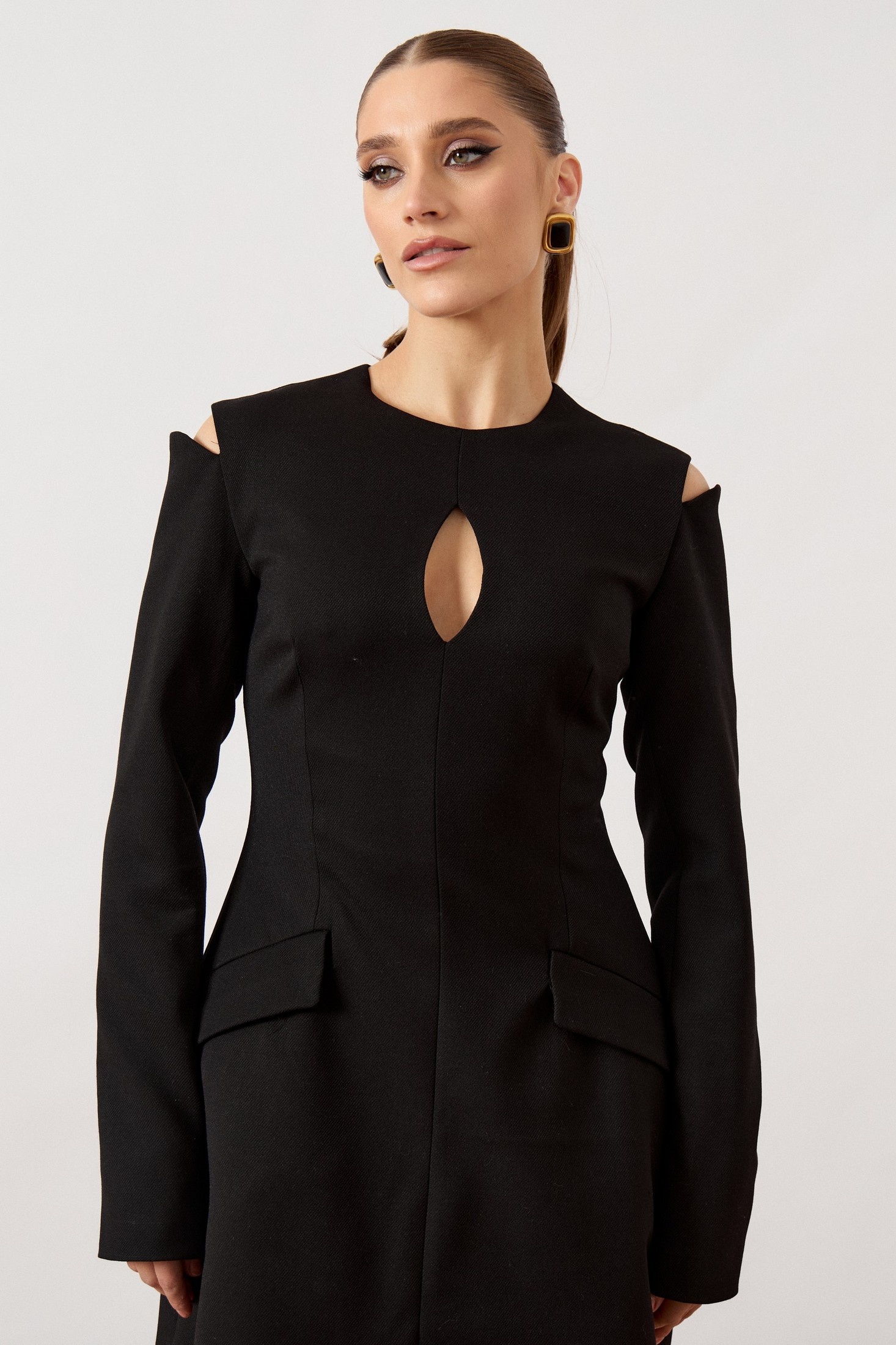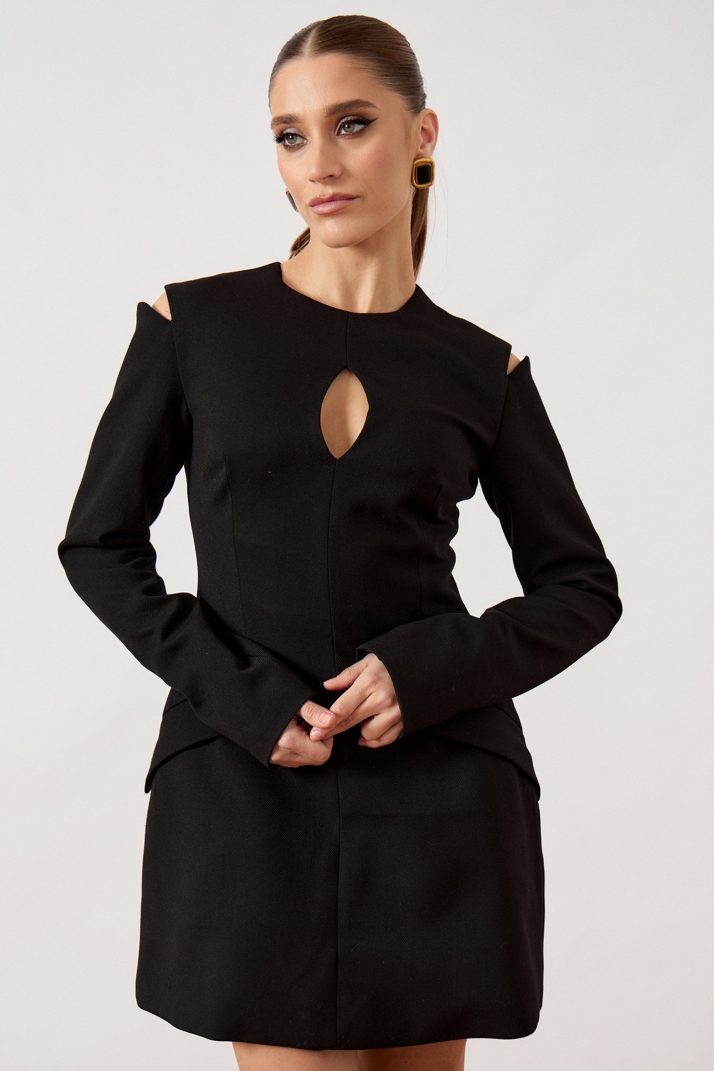 Платье 3512 ATTIKA от коллекции бренда ATTIKA предлагает уникальное сочетание современного стиля и комфорта. Изготовленное из плотной костюмной ткани с добавлением вискозы и полиэстера, это платье обеспечивает отличную посадку благодаря талиевым вытачкам. Его мини-длина и черный цвет придают элегантность, а открытые плечи и вырез в форме «капли» добавляют оригинальности. Фигурные вырезы плавно переходят в длинные рукава, что делает его отличным выбором для вечерних мероприятий. Декоративные клапаны на уровне бедер и потайная молния на спинке подчеркивают внимание к деталям. Идеально подходит для осенне-зимнего сезона.