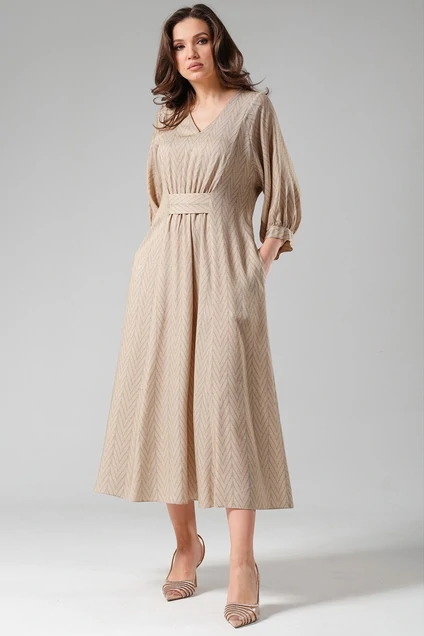 Элегантное платье полуприлегающего силуэта из лёгкой плательной ткани. В боковых швах - удобные карманы, рукав реглан, свободный, длиной 3/4. Длина платья по спинке в 46-50р -122 см, в 52-56р - 124 см.