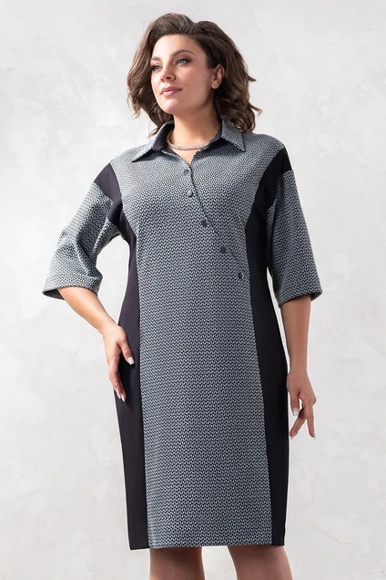 Элегантное трикотажное платье полуприлегающего силуэта. Трикотаж плотный, но эластичный. Воротник рубашечный, рукав втачной на спущенной пройме. На переде имитация застежки и небольшая шлица. Длина 105 см.