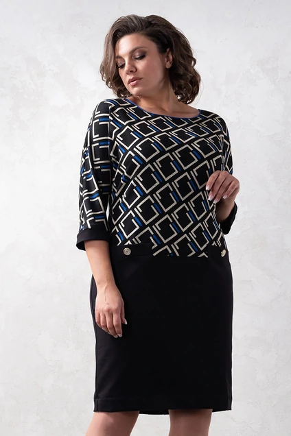 Удобное трикотажное платье полуприлегающего силуэта с имитацией карманов спереди. Трикотаж мягкий, приятный на ощупь, хорошо тянется. Рукав цельнокроенный, длина 3/4. В среднем шве спинки шлица. Длина 96 см.