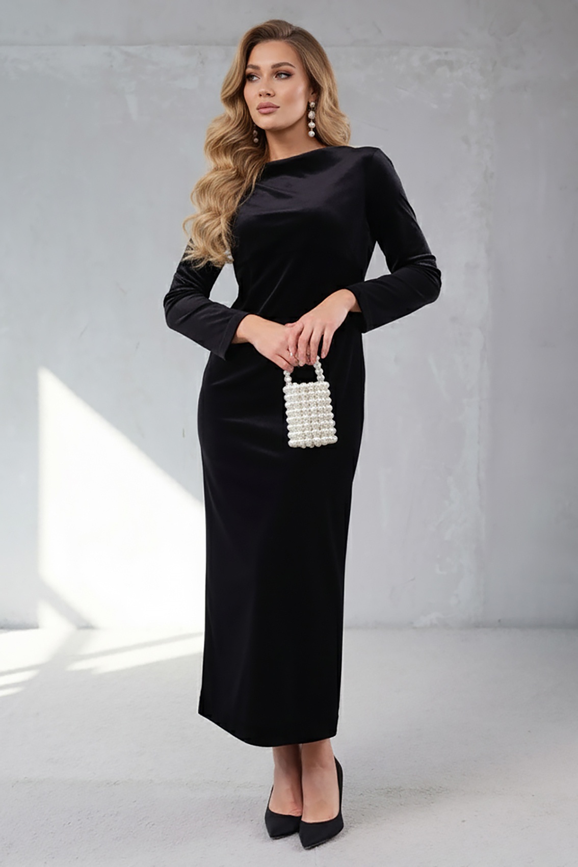 Фасон: прямой, облегающий силуэт без излишней драпировки, подчёркивает фигуру, но остаётся сдержанным и утончённым.