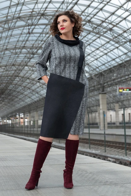 Трикотажное комбинированное платье свободного кроя. Трикотаж плотный, но эластичный. В боковых швах удобные карманы, рукав втачной. Длина 102 см, рукав 45 см.