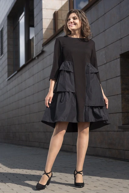 Трикотажное платье с воланами. Силуэт свободный, трикотаж плотный, но эластичный. В боковых швах удобные карманы. Длина 101 см, рукав 45 см