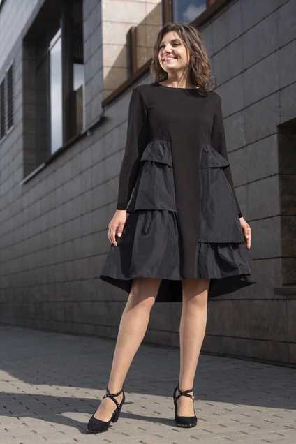 Трикотажное платье с воланами. Силуэт свободный, трикотаж плотный, но эластичный. В боковых швах удобные карманы. Длина изделия по спинке в 44-46-48 размерах 98см, в 50-52-54 размерах 100см. Длина рукава 62см.
