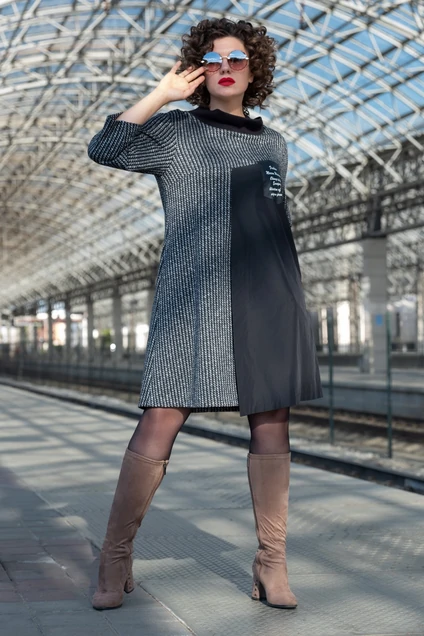 Трикотажное платье "А-силуэта". В боковых швах удобные карманы, трикотаж отлично тянется. Длина 96 см, рукав 45 см.