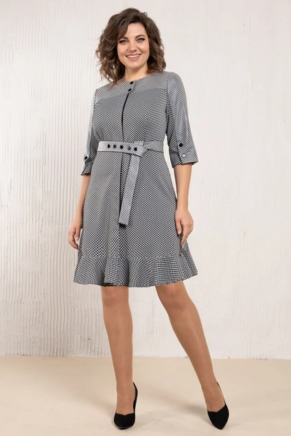 Трикотажное платье с воланом. Трикотаж плотный, отлично тянется. Блеск - это спец.обработка лицевой стороны трикотажа. Рукав втачной. На переде потайная застежка на пуговицы. Пояс съемный. Длина 88 см, рукав 41 см.