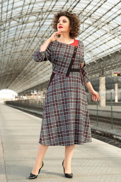 Трикотажное платье полуприлегающего силуэта. Трикотаж плотный, но эластичный. На переде отлетная деталь. Длина 117 см, рукав 47 см.
