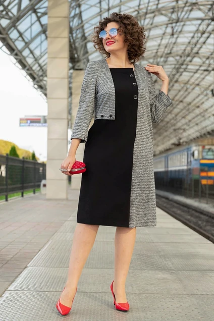 Элегантное трикотажное плвтье полуприлегающего силуэта. Трикотаж плотный, но эластичный. В боковых швах удобные карманы, на переде небольшая односторонняя складка. Рукав втачной. Длина изделия по спинке в 48-50-52 размерах 102 см, в 54-56-58 размерах 105 см. Длина рукава 51 и 52см соответственно.