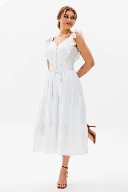 Платье-сарафан полуприлегающего силуэта, отрезное по линии талии. Застёжка лифа центральная на петли-пуговицы. По переду и спинке лифа рельефы с притачными рюшами переходящими на бретель. Юбка А-силуэта, состоит из 3 воланов со сборкой. Платье на подкладке (хлопок). Декоративный пояс с пряжкой из основной ткани. Длина юбки сбоку 82 см.