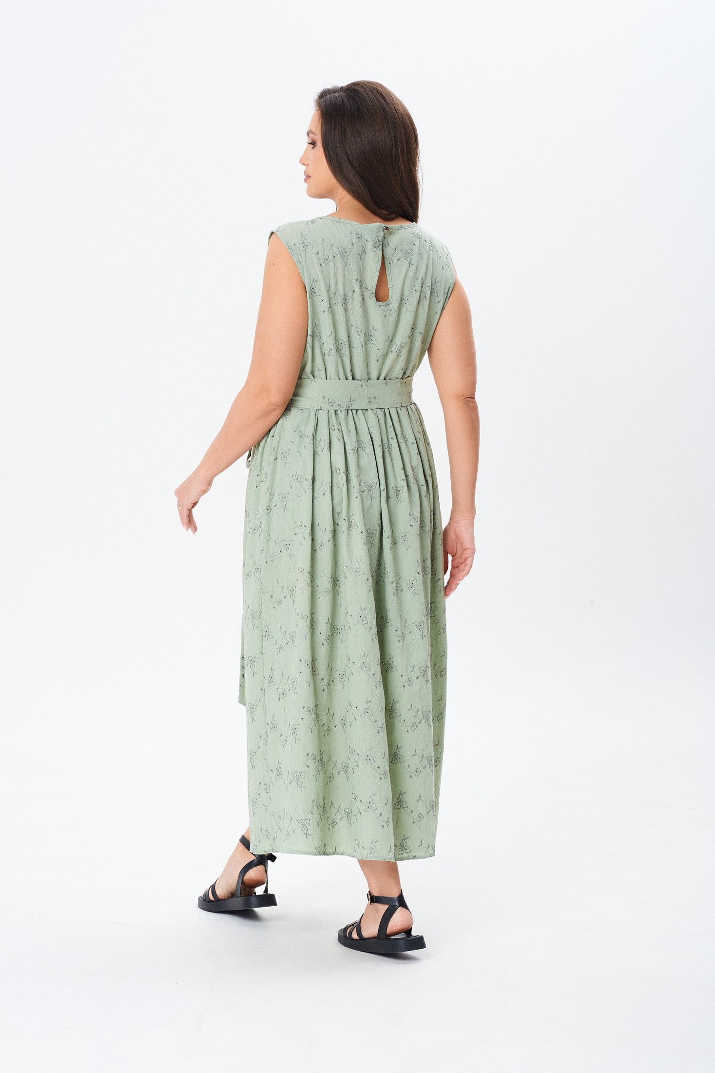 Верхняя часть изделия выполнена без рукавов, с нагрудными вытачками. Завышенная талия выгодно подчёркивает силуэт, и удлиняет фигуру. Горловина округлой формы, обтачная. По спинке платья выполнен фигурный подрез в виде капельки, который застегивается на навесную петлю-пуговицу. В области талии платье слегка присобрано на резинку. Нижняя часть платья выполнена на подкладке из основной ткани. В комплект входит пояс из основной ткани, благодаря которому можно выгодно подчеркнуть достоинства Вашей фигуры!