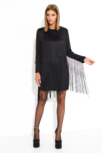 подрезы по переду и спинке, локтевой шов рукава оформлен декоративной тесьмой бахромой.