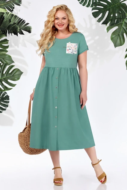 Платье женское комбинированное,удлиненное, расширенное к низу, выполнено из двух видов ткани-лиф платья и рукава из трикотажного полотна кулирная гладь,а нижняя часть из рубашечной ткани с содержанием хлопка.Перед с печатью, имитация кармана,на лифе и декоративной планкой с пуговицами по центру нижней части.Спинка со средним швом по лифу.Нижняя часть со сборкой по верхнему срезу.В боковых швах карманы.Рукава втачные одношовные короткие,с патами и декоративными пуговицами,нижний срез не обработан,а закручен на лицо.