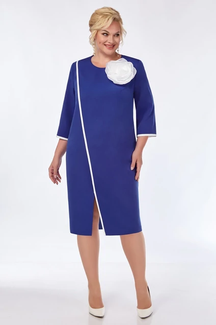 Платье женское нарядное полуприлегающего силуэта,выполнено из плательно-костюмной ткани.Перед слева с нагрудной вытачкой,а справа с рельефом от плеча до низа и заканчивается разрезом,шов окантован контрастной бейкой .Спинка со средним швом и талиевыми вытачками. Рукава втачные одношовные длиной 3/4 по низу контрастная бейка.Платье дополнено декоративным съемным цветком.