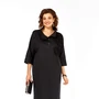 Платье женское полуприлегающего силуэта выполнено из джинсовой ткани.Перед со средним швом, заканчивающимся разрезом,кокетками и рельефами от них до бокового шва,в шве выполнены карманы с листочкой.Круглый вырез горловины с планками по переду.Спинка со средним швом и талиевыми вытачками.Рукава втачные двухшовные длинной 3/4,низ на притачных манжетах. Платье укомплектовано поясом , выполненным из основной ткани .Пояс,кокетки,планки,листочки и манжеты отсрочены декоративными контрастными строчками.