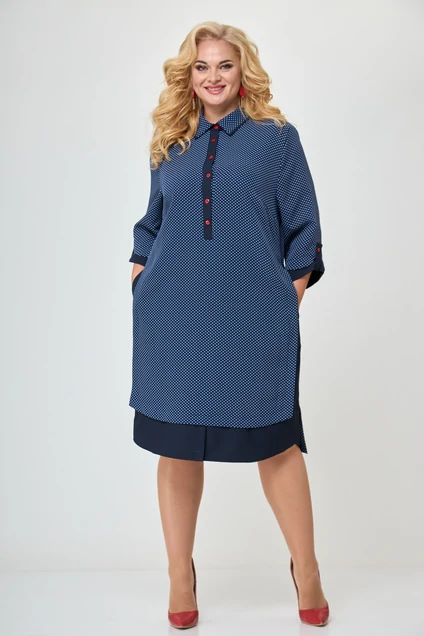Платье женское, прямого силуэта, с эффектом двойного платья. Нижнее платье, воротник, верхняя планкк платья и манжеты по рукаву выполнены из однотонной ткани. Верхнее платье - спинка цельнокроенная, по бокам на обтачках. Перед с нагрудными вытачками и втачной планкой на пуговицы. Воротник отлажной на стойке. Рукав втачной одношовный на пату и манжету.