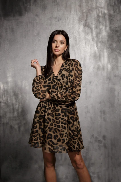 Платье женское, выполнено из шифона. Платье отрезное по линии талии. Застежка центральная на петли и пуговицы. Вырез горловины V-образный, с широким воротником с остыми углами.
