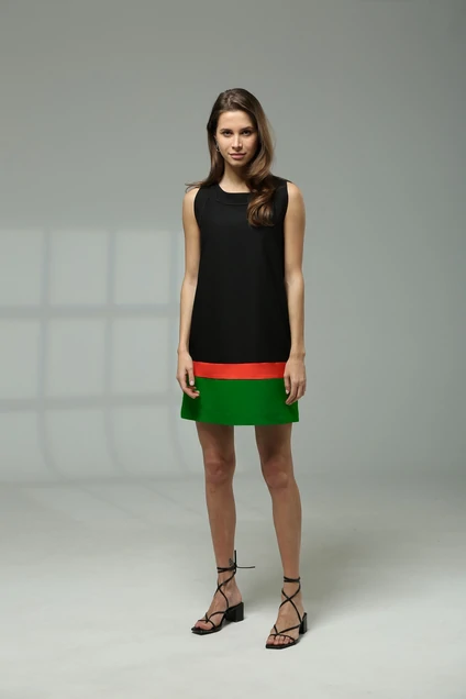 Платье полуприлегающего силуэта, скомбинировано из тканей трех цветов. Без рукавов, пройма обработана обтачками с лицевой стороны. Вырез горловины округлый. Застежка сзади на навесную петлю и пуговицу.