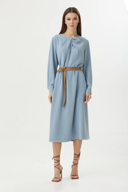 Платье-рубашка прямого силуэта, застежка центральная на петли и пуговицы. Горловина округлой формы с воротником - стойкой. Плечо чуть спущено. Рукав втачной двух шовный, низ рукава оформлен разрезом на манжете с двумя пуговицами.