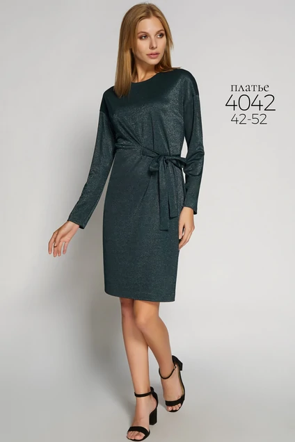 Платье свободного кроя из трикотажного полотна с округлым вырезом горловины спущенной линией плеча с придаточными рукавами. Перед с декоративной завязкой Из основной ткани. В среднем шве спинки обработано потайная молния.