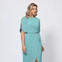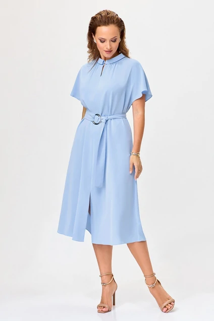 Нежное, лёгкое, комфортное платье А-образного силуэта, выполнено из лёгкой, приятной однотонной ткани. Модель с цельнокроёными рукавами, заканчивающимися разрезами, со щелевидным вырезом со сборкой по горловине переда, отложным воротником с застёжкой на навесную петлю и ювелирную пуговицу и очень женственным разрезом в среднем шве переда. Для создания приталенного силуэта предусмотрен интересный пояс в тон, красиво подчёркивающий талию.