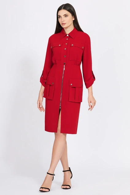 Это модное платье добавит стиль в вашу повседневную жизнь. Серебряная молния и пуговицы добавляют изысканность, а накладные карманы, слегка спущенные рукава с патами, рубашечный воротник и отделочные строчки придают образу спортивный,крутой штрих. Свободный лиф платья позволяет чувствовать себя комфортно, а приталенная юбка и разрез придают платью женственный характер. Модель, выполненная из приятной, однотонной ткани, универсальна и отлично смотрится как в повседневных образах,так и в офисе с нестрогим дресс-кодом.