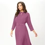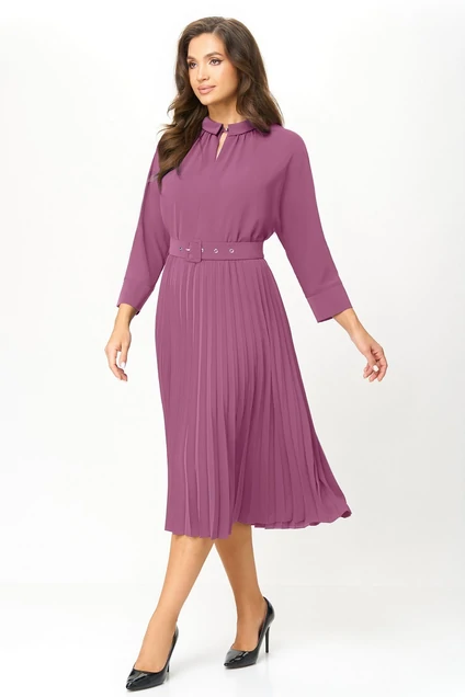 Элегантное плиссированное платье миди насыщенного сиреневого оттенка. Дизайн платья включает цельнокроеные рукава с манжетами, щелевидный вырез с собирающейся горловиной и отложной воротник. Застёжка на воротнике дополнена навесной петлей и украшена ювелирной пуговицей. Тонкий пояс с пряжкой элегантно подчеркивает талию, подчеркнутую скрытой резинкой. Платье изготовлено из мягкой, приятной к телу и практичной в носке ткани, которая не мнется. Создайте изысканный и стильный образ с этим прекрасным платьем, идеально подходящим для различных событий.