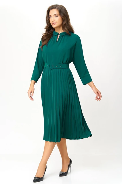 Элегантное миди-платье изысканно зелёного цвета создаст особенный акцент в вашем гардеробе. Модель отличается продуманным дизайном: мягкая плиссировка добавляет объем и ритмичность женственной силуэту, а цельнокроеные рукава с манжетами подчеркивают изящество линий. Отложной воротник с щелевидным вырезом и изящная застёжка с ювелирной пуговицей придают облику завершенность. Талия акцентирована скрытой резинкой и элегантно подчеркнута поясом с пряжкой в тон, идеально дополняющим образ. Платье выполнено из высококачественной немнущейся ткани, что обеспечивает комфорт и безупречный вид на весь день.