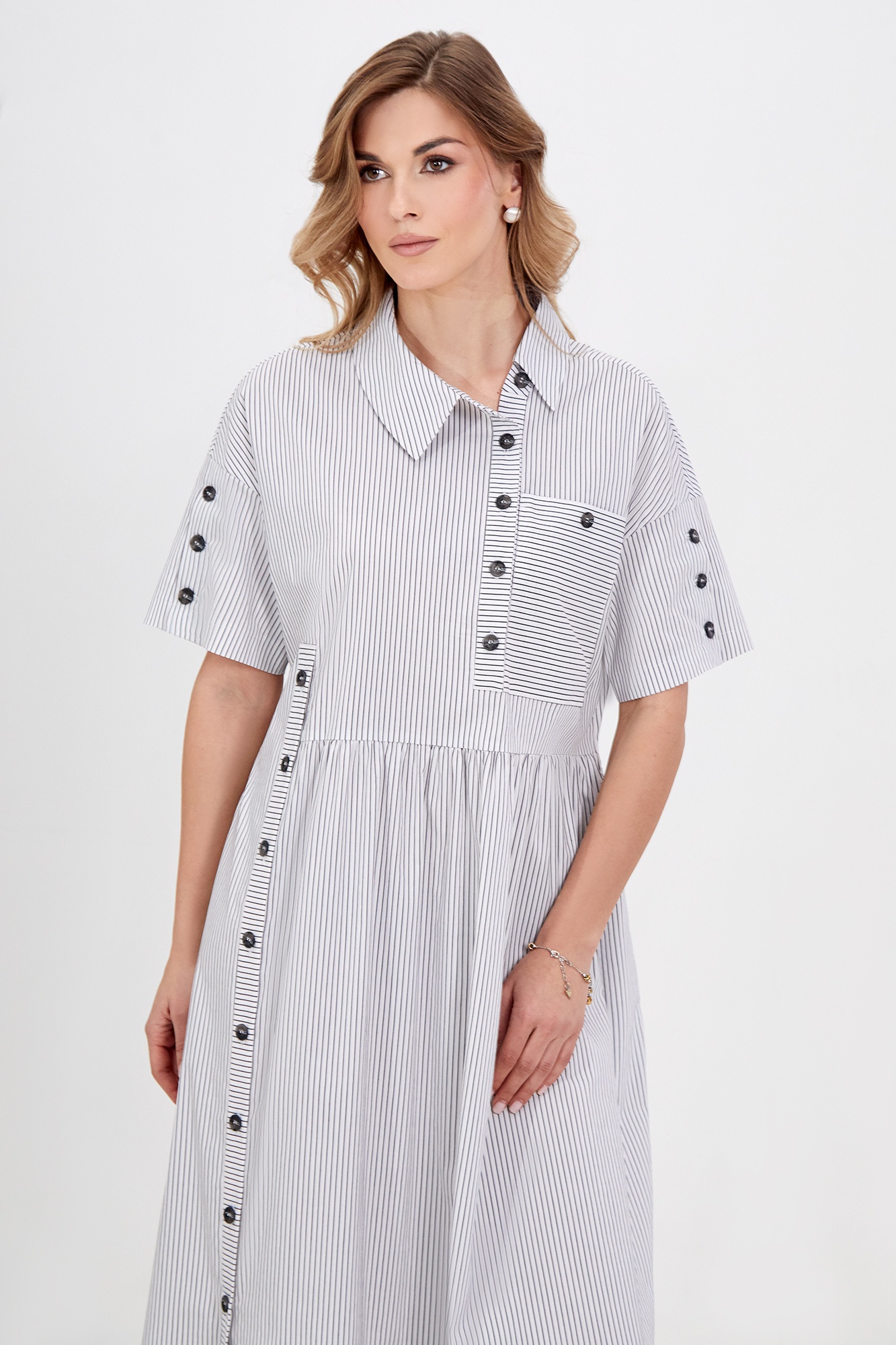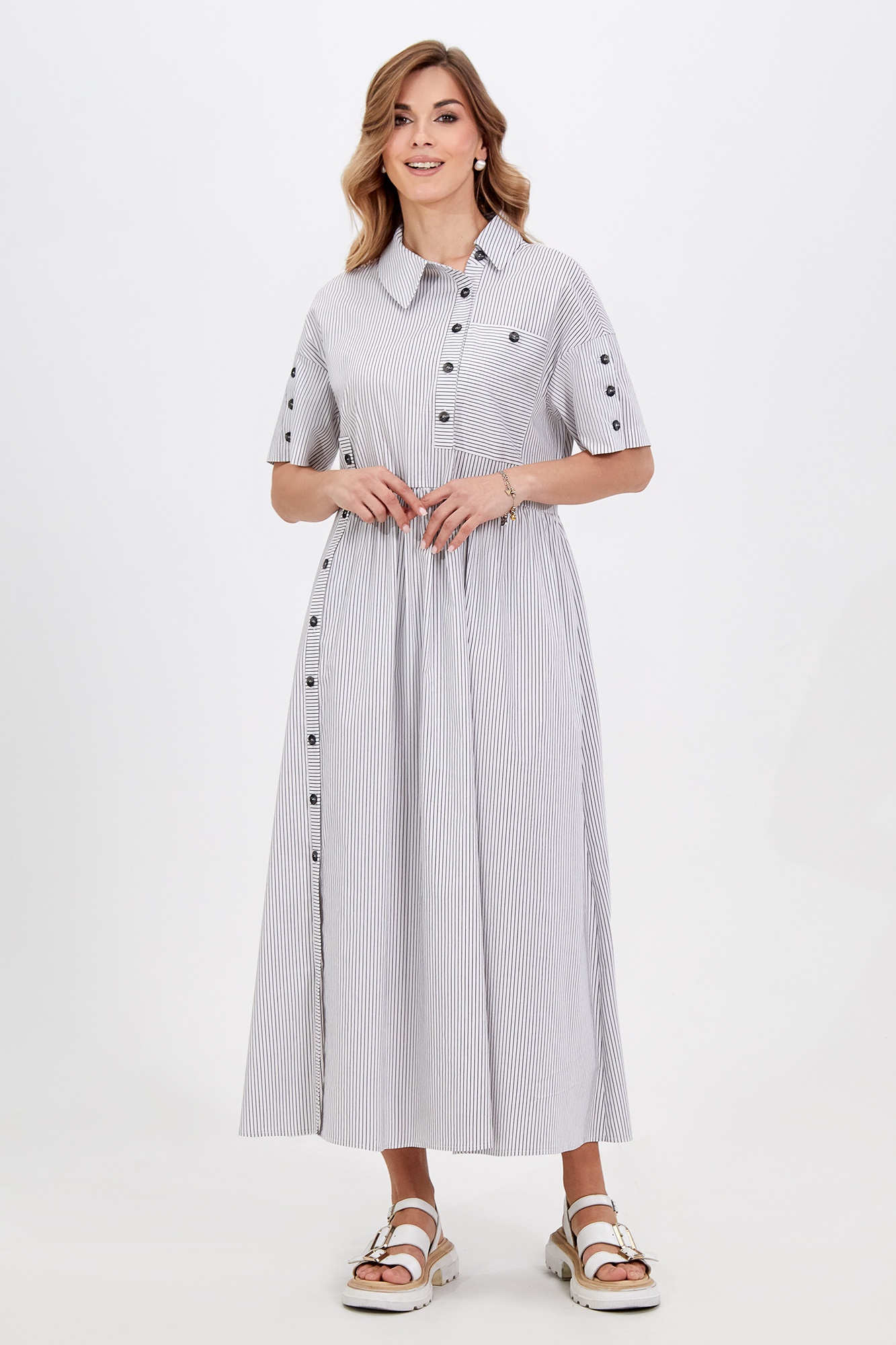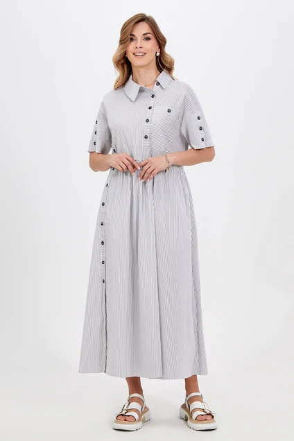 Платье 5026 Bazalini — идеальный выбор для тех, кто ценит стиль и комфорт. Коллекция бренда Bazalini предлагает элегантное платье, выполненное из смесового материала на основе хлопка, обеспечивающего легкость и приятные ощущения на коже. Свободный крой с модными оборками, застёжка на петли-пуговицы и асимметричный отложной воротник с отрезной стойкой придают образу современный вид. Практичные детали, такие как отделочный карман и карманы в боковых швах, подчеркивают функциональность. Длина миди делает это платье универсальным решением как для повседневных прогулок, так и для более официальных мероприятий. Легкий хлопковый материал отлично подходит для теплого сезона, а полосатый рисунок добавляет динамики образу.