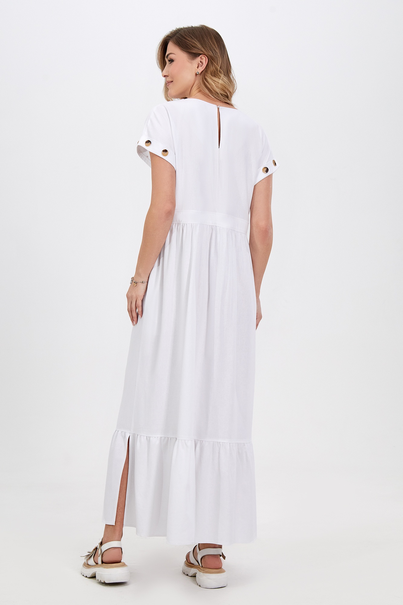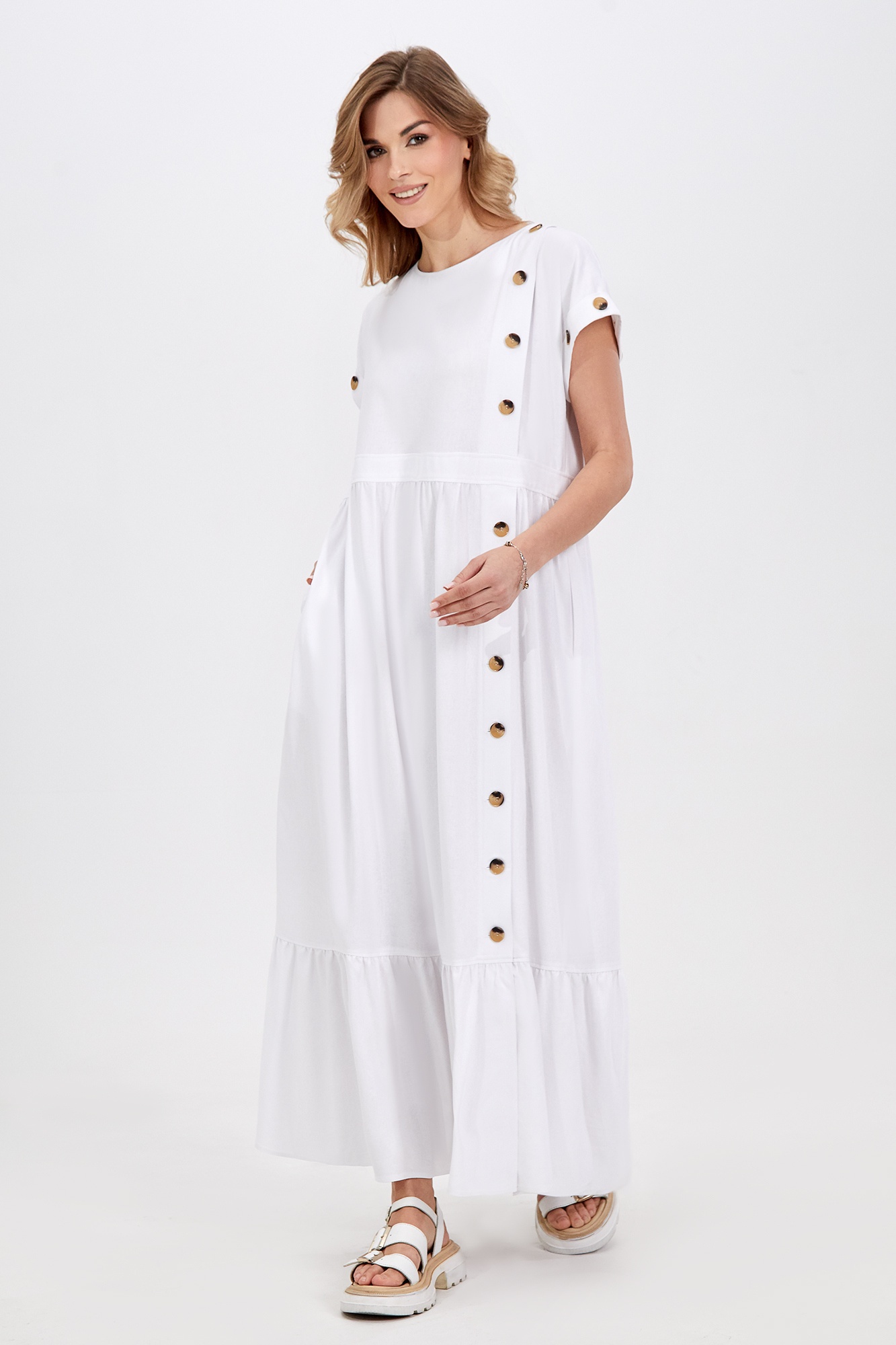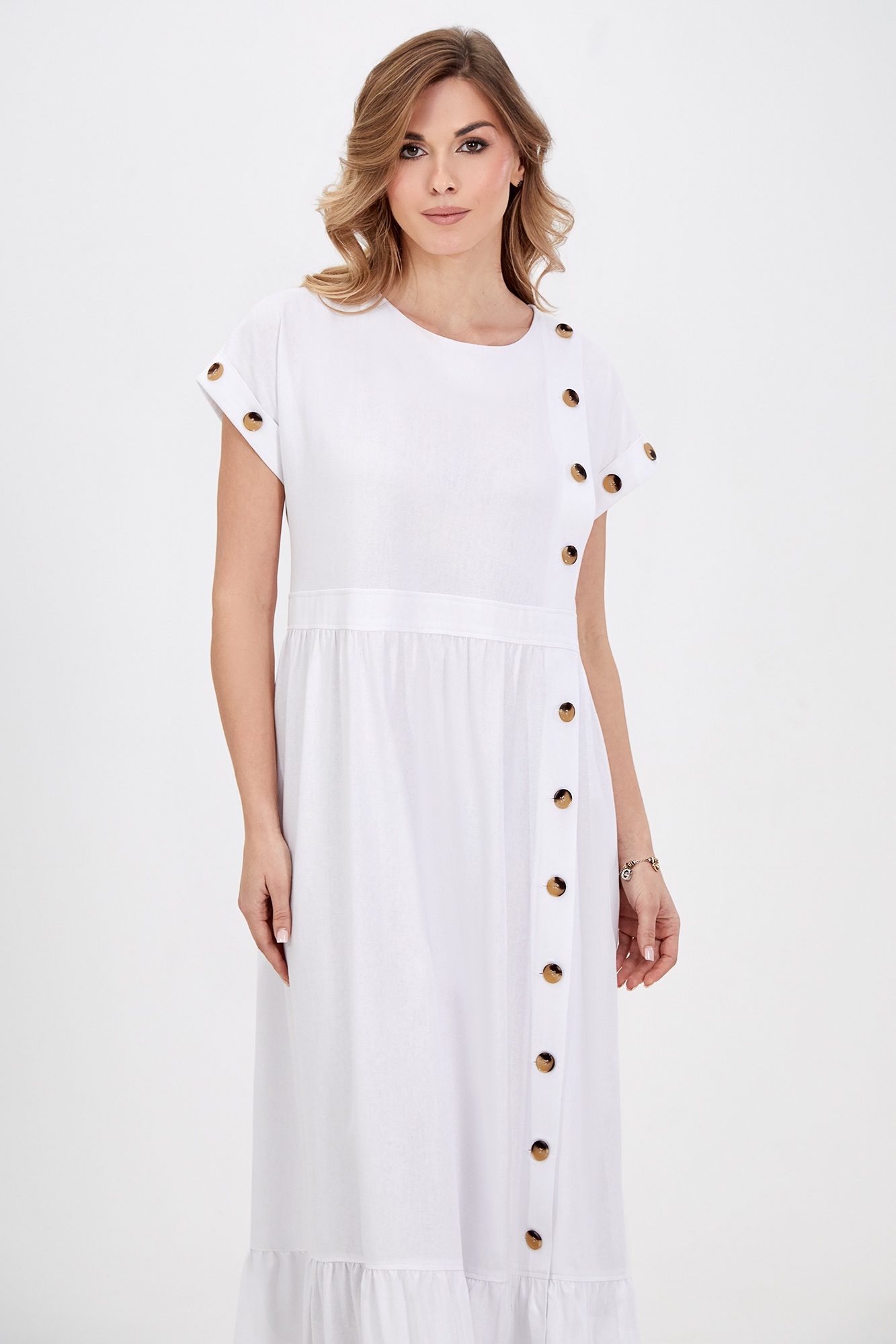 Платье 5032 Bazalini — идеальный выбор для повседневного гардероба. Коллекция бренда Bazalini предлагает модель из мягкого материала на основе льна, обеспечивающего комфорт и лёгкость. Свободный силуэт с округлой формой горловины и каплевидной застёжкой по спинке подчёркивает гармоничный стиль. Цельнокроеные рукава с отворотами и декоративными пуговицами добавляют особый шарм. Платье белого цвета с мидакси длиной, боковыми карманами и смещённой планкой с контрастными пуговицами делает образ стильным. Разрезы на оборках смягчают спортивное направление, делая модель универсальной, подходящей как для отдыха, так и для работы в тёплое время года. Длина изделия позволяет носить его как с каблуками, так и на плоском ходу.