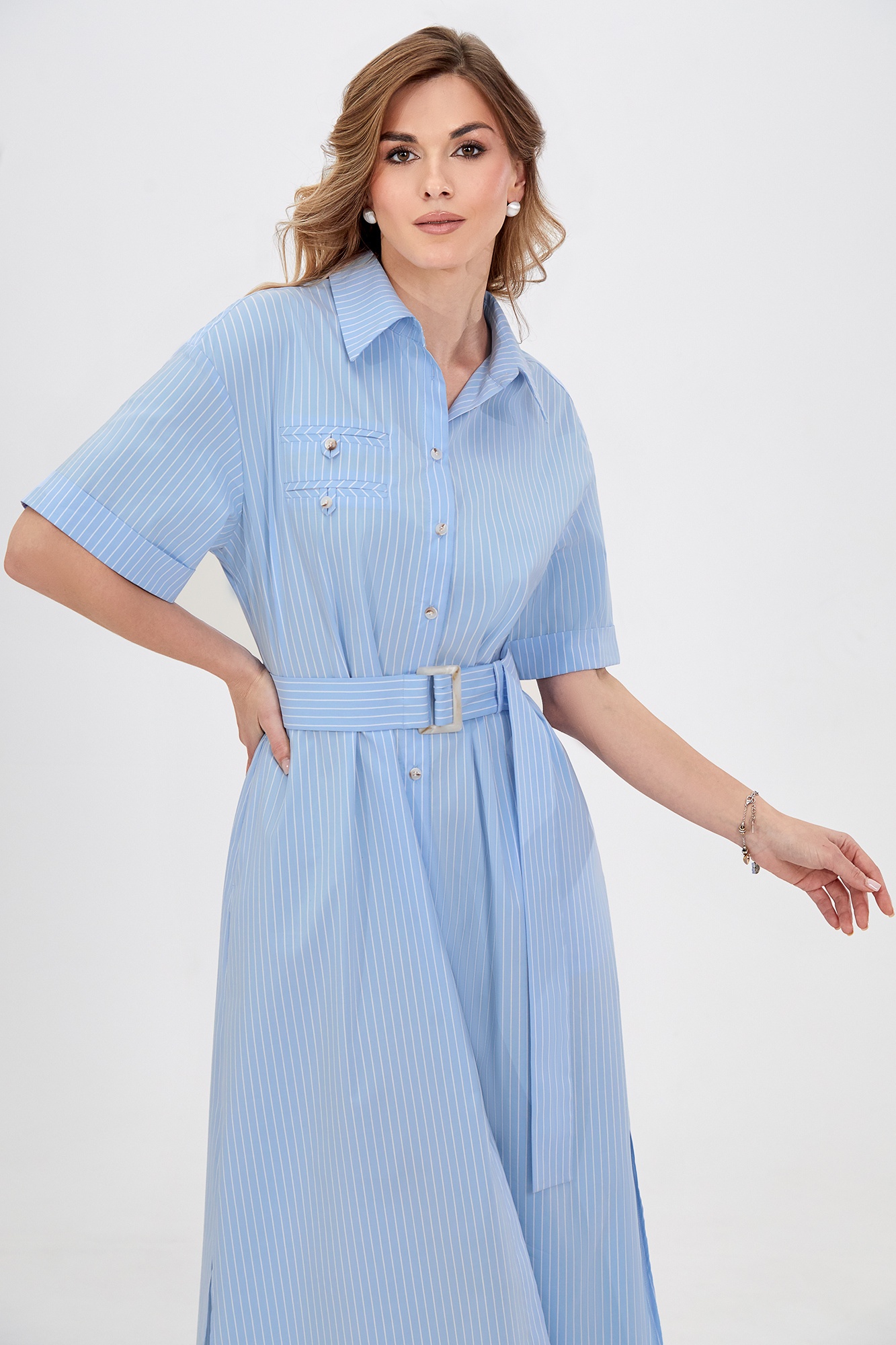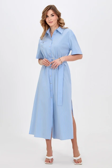 Платье 5033 Bazalini сочетает в себе элегантность и комфорт. Коллекция бренда Bazalini представляет модное платье-рубашка в тонкую полоску, выполненное из хлопковой ткани, которая дарит комфорт и легкость. Фасон миди с боковыми разрезами и поясом, подчеркивающим талию, добавляет женственности. Рубашечный воротник и застежка на пуговицы создают стильный образ, а нагрудные карманы-обманки завершают дизайн. Этот наряд идеально подходит для весны и лета, и может использоваться как на каждый день, так и для работы. Стильное голубое платье отлично впишется в ваш гардероб.