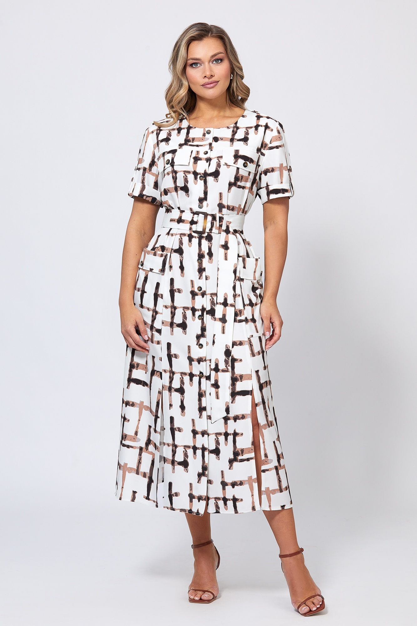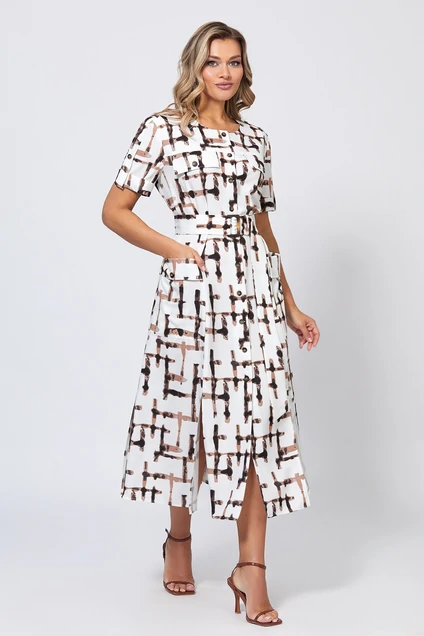 Платье 5057 Bazalini — это идеальное сочетание стиля и комфорта. Коллекция бренда Bazalini предлагает платье миди длины с расклешённым силуэтом, выполненное из экологичного материала на основе вискозы, что гарантирует дышащие свойства и комфорт в носке. Оригинальный рисунок, состоящий из геометрических узоров, придаёт изделию модный вид. Округлый вырез горловины и короткие рукава с отделочным патами подчёркивают современный стиль, а пояс из основной ткани акцентирует талию. Это платье идеально подходит для лета и весны, и станет прекрасным выбором для повседневного использования. Практичные накладные карманы и стильные разрезы в рельефах добавляют функциональность и динамику образу.