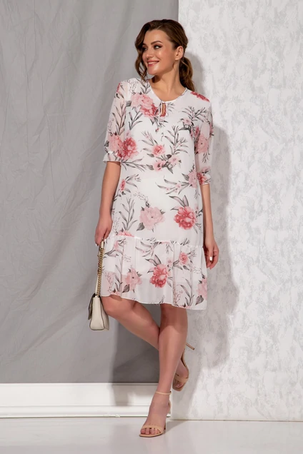 Мы представляем вашему вниманию легкое, нарядное, элегантное платье. Выполнено из легкой, плательной ткани типа «шифон». Прямой, свободный крой.Передняячасть платья с двумя нагрудными выточками. Спинка  цельнокроеная. По нижней части платья располагается отрезной волан, шириной примерно25см. Горловина округлой формы с разрезом в виде капли по переду. Обработана косой бейкой с переходом в завязки.