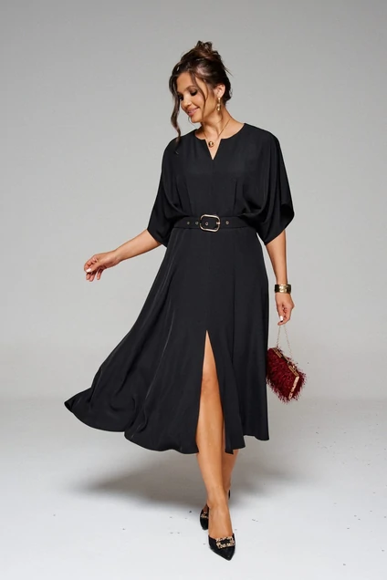 Платье женское, в нарядно-романтическом стиле; отрезное по линии талии; выполнено из лёгкого, струящегося, костюмно-смесового полотна. У этой ткани нежная, гладко-бархатистая фактура, приятная на ощупь, и матовая поверхность. Она легко драпируется и очень выгодно и дорого подчёркивает ваш неповторимый образ. Передняя, верхняя часть платья разрезная по среднему шву, в верхней части которого расположен небольшой треугольный разрез. Спинка разрезная по среднему шву, в который вставлена длинная, потайная молния. Конструкция верхней части платья выполнена в свободном стиле со спущенной линией плеча и глубокими складками на линии талии. Нижняя, передняя часть платья свободного кроя, состоит из 4-х клиньев с разрезом спереди. Задняя, нижняя часть состоит из 2-х частей. Горловина округлой формы. Рукав цельнокроеный, объёмный, со спущенной линией плеча. В комплекте к платью прилагается широкий пояс на пряжке.