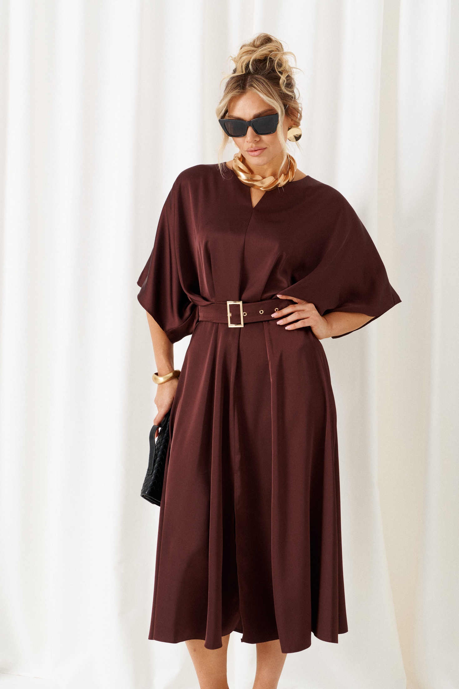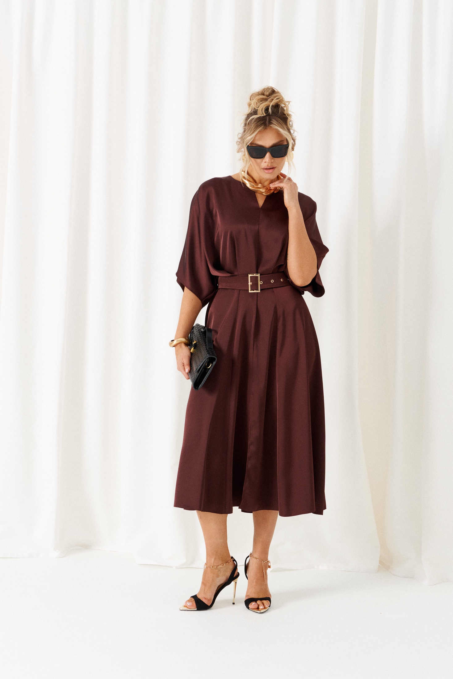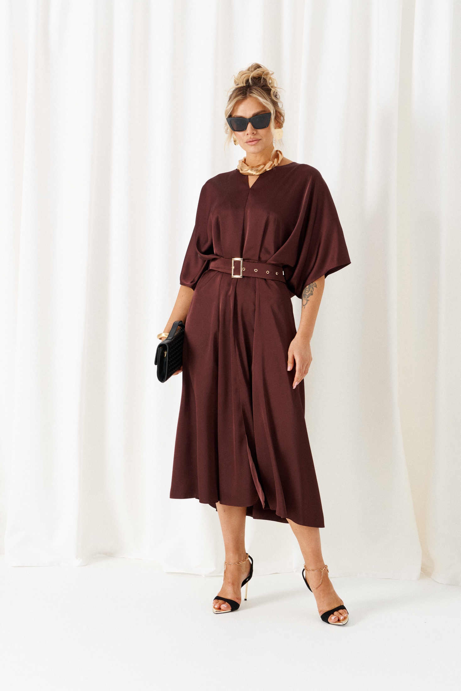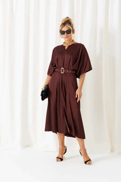 Платье 6443 шоколад Beautiful&Free представляет собой модный выбор для женщин, ценящих стиль и комфорт. Коллекция бренда сочетает лёгкую и струящуюся вискозу и полиэстер, что делает платье приятным на ощупь и удобным для носки. Силуэт платья подчёркивает талию с помощью широкого пояса на пряжке. Спущенные плечи и объёмный цельнокроеный рукав добавляют неформальной элегантности образу. Этот наряд выполнен в универсальной миди длине и имеет потайную молнию на спине для удобства. Шоколадный оттенок придаёт образу стильный и насыщенный вид. Платье идеально подойдёт для любого сезона и будет уместно как на деловой встрече, так и на вечернем мероприятии. Длина изделия по спинке составляет 124 см, а длина рукава — 40-42 см.