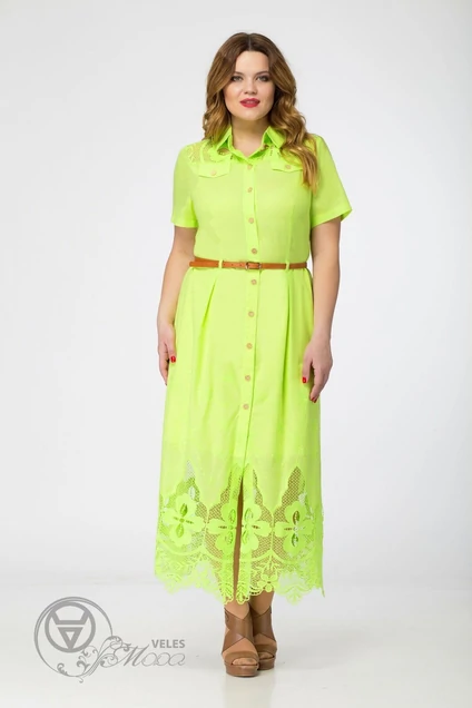 Длина по спинке 134 см Длина рукава 22 см Стильное женское платье ,полуприлегающего силуэта,выполнено из хлопчатобумажной ткани с вышитым кружевом.Отрезное по линии талии.Застежка центральная на декоративные пуговицы,воротник рубашечный.В комплекте- съемный пояс в тон пуговиц.Рукав короткий,втачной.