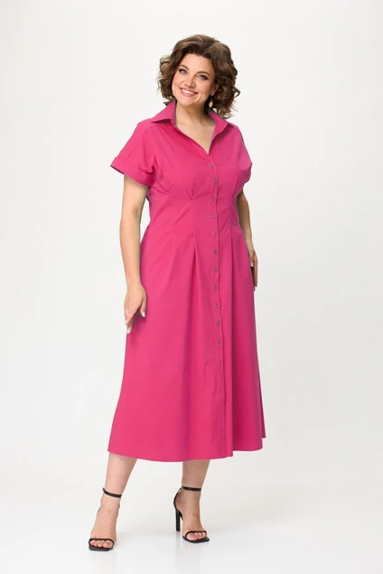 Платье на линии талии заложено в складки по переду и спинке. Платье с центральной застежкой на петли пуговицы. Горловина оформлена рубашечным воротником на стойке.
