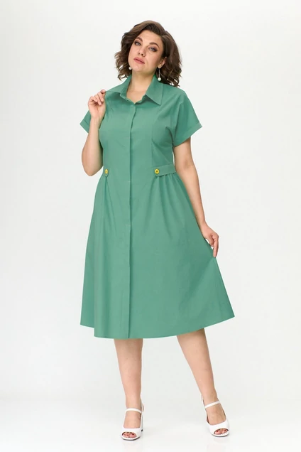 Платье с центральной потайной застежкой на петли пуговицы, горловина оформлена рубашечным воротником. Рукава короткие цельновыкроенные с отложной манжетой. Платье украшено отделочными строчками в цвет пуговиц.