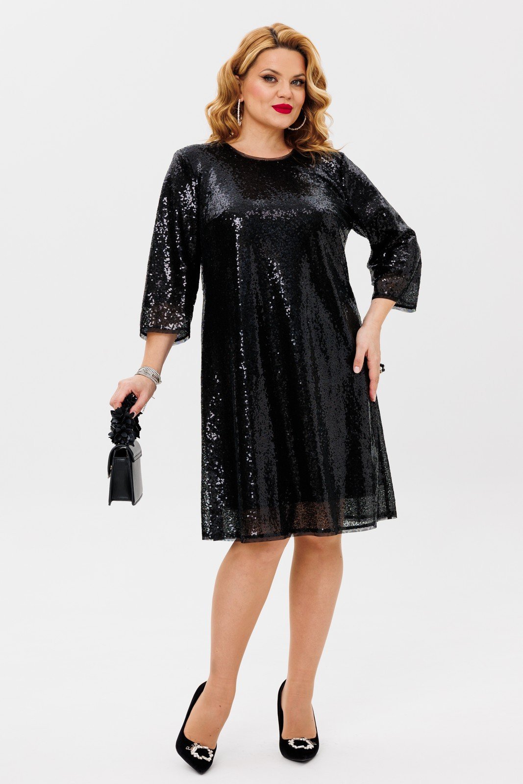 Элегантное платье А-силуэта из черных пайеток создаст стильный и запоминающийся образ на любом мероприятии. Отделка из мягкой сетки по краю горловины и нижней части рукавов обеспечивает комфортное ношение, предохраняя кожу от контакта с пайетками. Модель с втачными рукавами 3/4 и лаконичной спинкой идеально подойдет для корпоративных вечеров, встреч с друзьями или торжественных событий. Нагрудные вытачки гарантируют отличную посадку. Это платье — идеальный выбор для тех, кто ценит роскошь и комфорт.