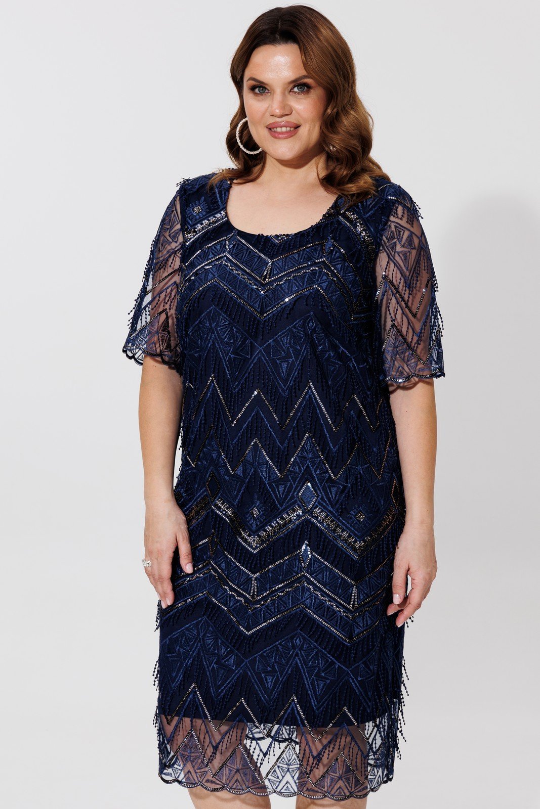 Это элегантное нарядное платье идеально подойдет для торжественных моментов. Платье выполнено в темно-синем цвете с нарядной черной вышивкой, создающей изысканный геометрический узор. Дизайн включает два слоя ткани: верхний слой представляет собой прозрачную сетку с вышивкой, а нижний слой - гладкий атлас, который добавляет изделию блеск и нарядность. Платье имеет полуприлегающий силуэт, круглый вырез горловины и втачные рукава средней длины, которые расширяются к низу и декорированы подогнутой каймой. Длина платья до колена подчеркивает его стильность и элегантность, делая его универсальным выбором для любого торжественного события.