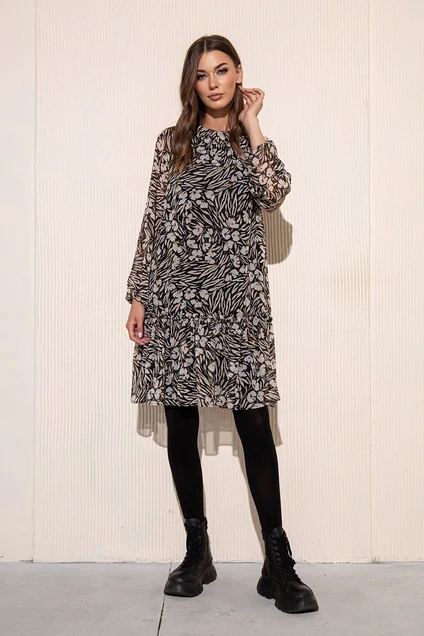 Платье из шифона А-силуэта с воланом по низу. Воротник со сборкой на резинках. Рукава-реглан, по низу на резинке. Платье на подкладке.